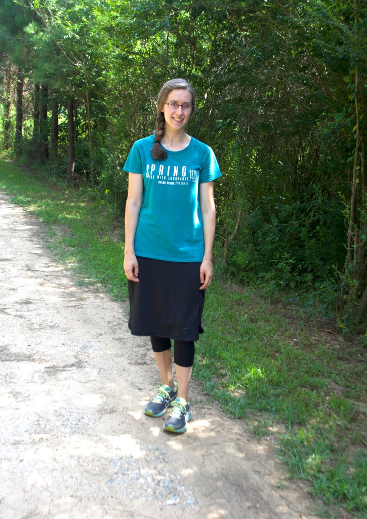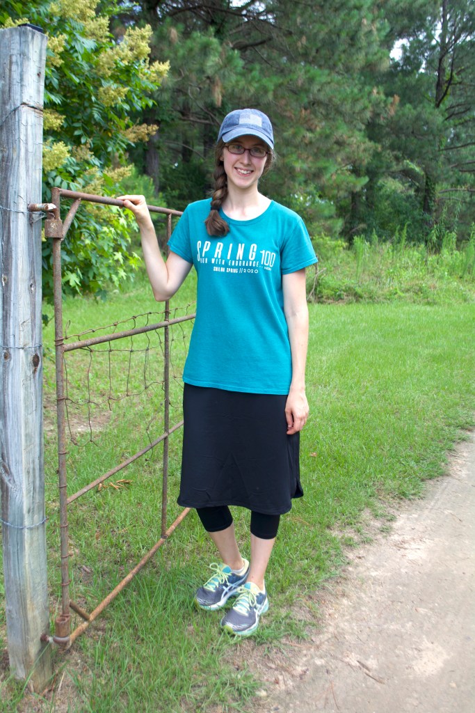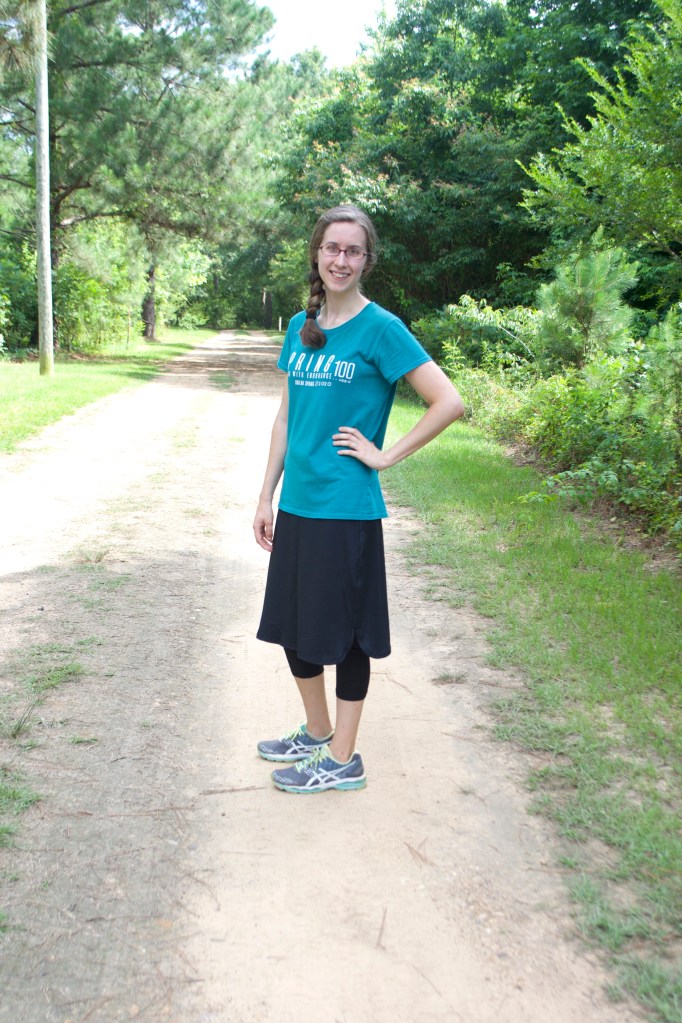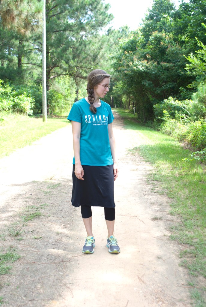 I got it in the mail this week, and I was pleasantly surprised with this skirt – the modest fit, how comfortable it was, and how cool the material was even in Arkansas’ humid, 100 degree heat index summer weather. 😛 (I might add, though, that I am typically cold natured, so if you are more hot natured the longer leggings might be a problem if you live somewhere that has hot summers.)