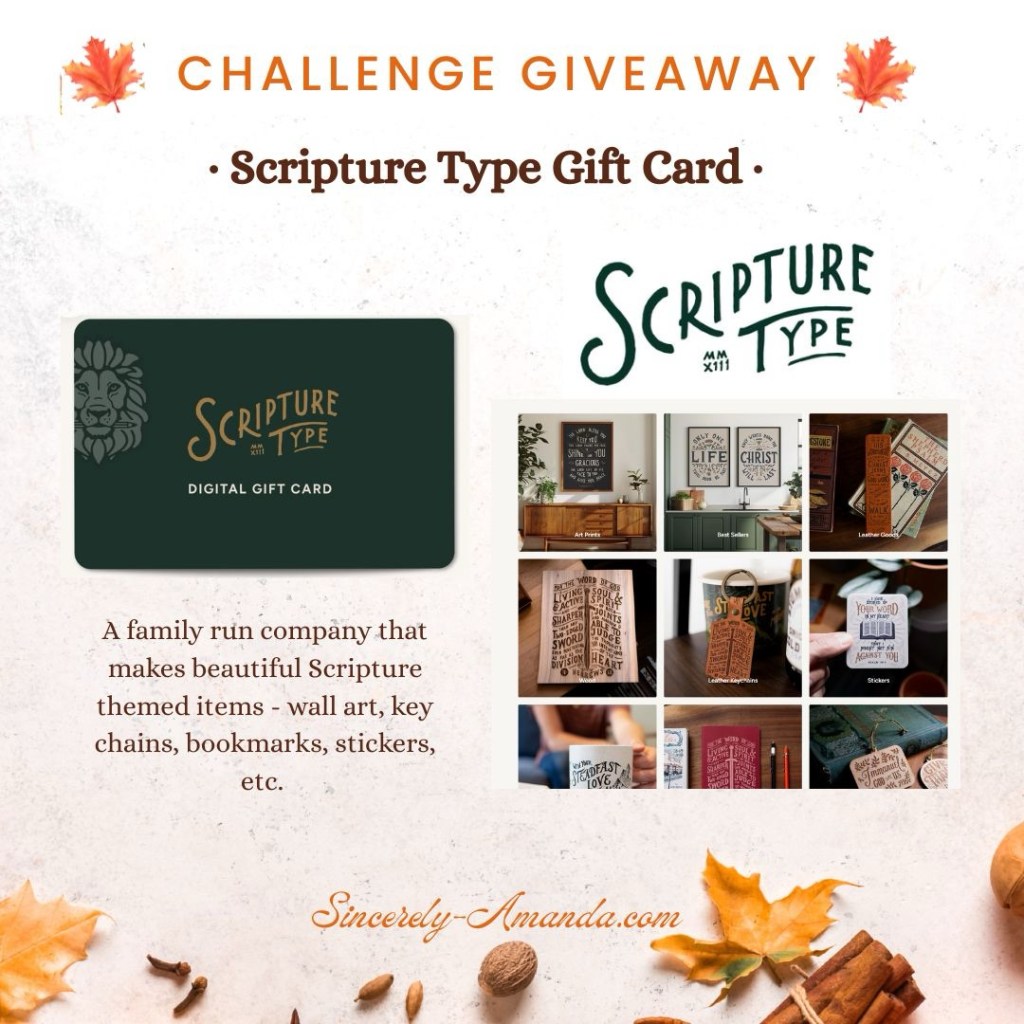 Those who complete the challenge of writing down at least 5 things you are thankful for each day for the month of November will have the chance to enter a giveaway. I’m super excited about this year’s giveaway, which is a gift card to Scripture Type. This is a family owned and operated business, and they make beautiful products that display the Word of God. Some of the things they have are Scripture wall signs, key chains, bookmarks, wood engravings, and stickers.