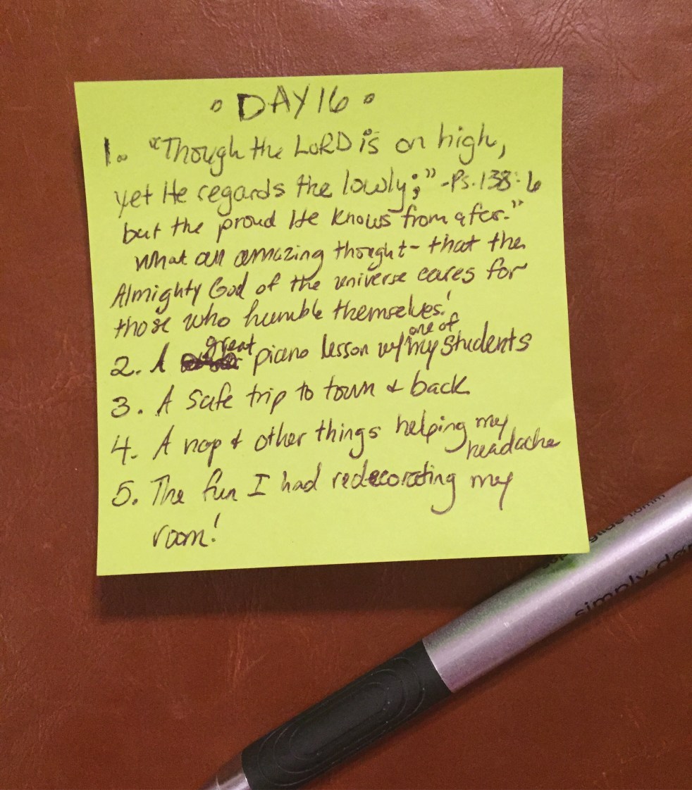 Today I am thankful for... 1. ”Though the LORD is on high, yet He regards the lowly; but the proud He knows afar off.” -Psalm 138:6 What an amazing thought...that the Almighty God of the universe cares for and looks upon those who will humble themselves! 2. A great piano lesson with one of my… Continue reading Day 16 – In Everything Give Thanks Challenge